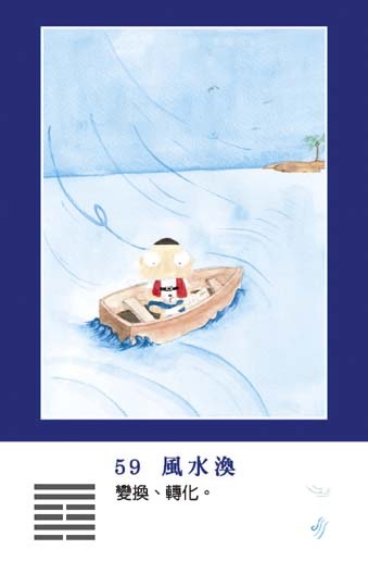 圖像解析:主角乘坐小船在海中航行,強風吹拂海面激起浪花,船身會有翻覆的危險,但風力可以改變、轉換船行方向,未必全然是壞事。男主角面對無時無刻都在變化的風向、浪潮,保持機靈與彈性、順勢前進,終能安全、順利抵達陸地。寓意在海洋中航行如同人生,過程中必定會有風險、起伏與變化,只要能夠放鬆心情、順隨情勢,適時轉化自己的心境及做法,就能化險為夷,帶領我們找到正確的方向。走不通時,不妨變化、轉換作法,一定可以解決當下的問題,並且有有意想不到的收獲。